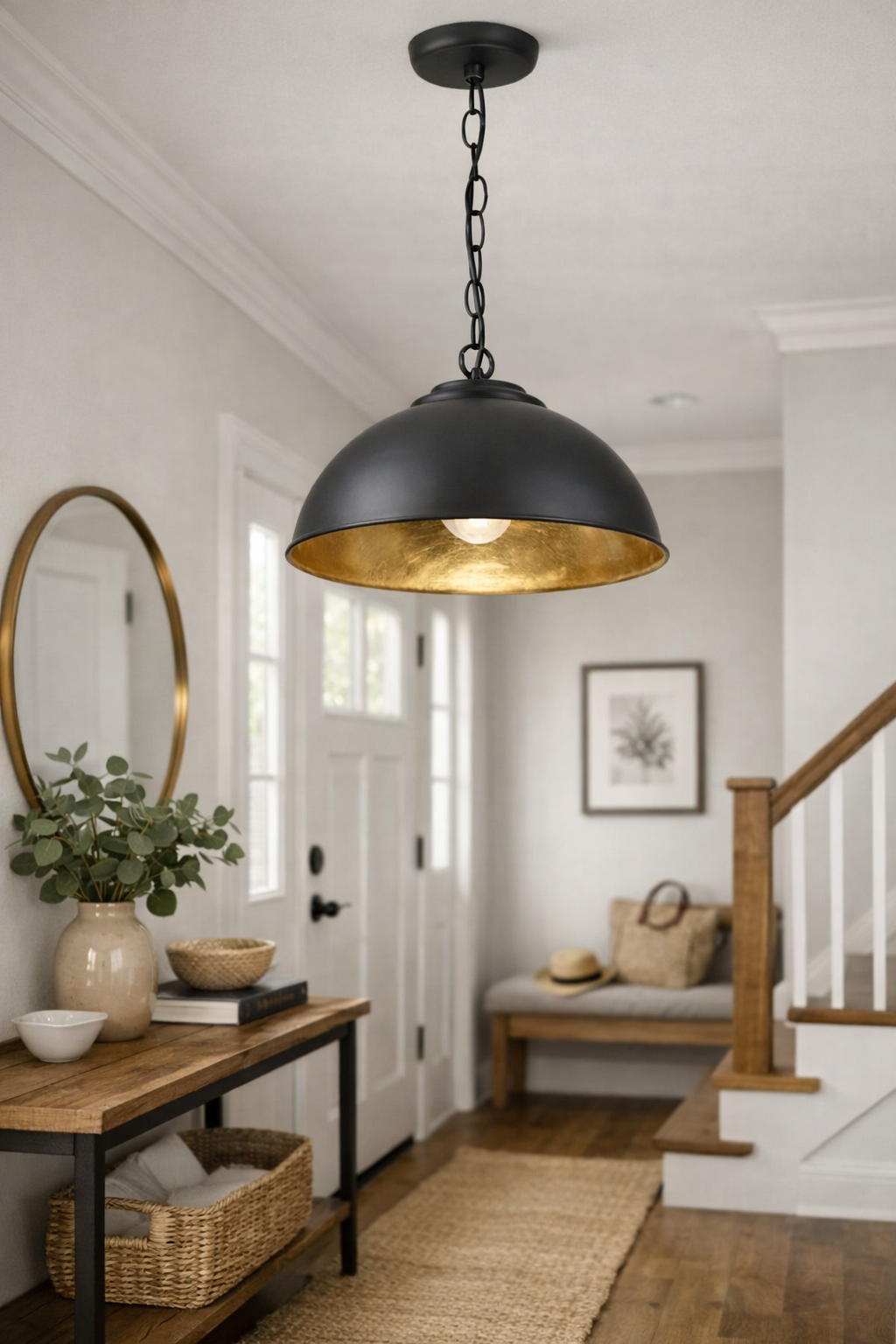 Transform your interior with the striking Endon Colman Black & Gold Leaf Ceiling Pendant Light. Designed with a matt black steel exterior and a shimmering gold leaf inner, this premium pendant light delivers a warm, luxurious glow that instantly elevates any room.