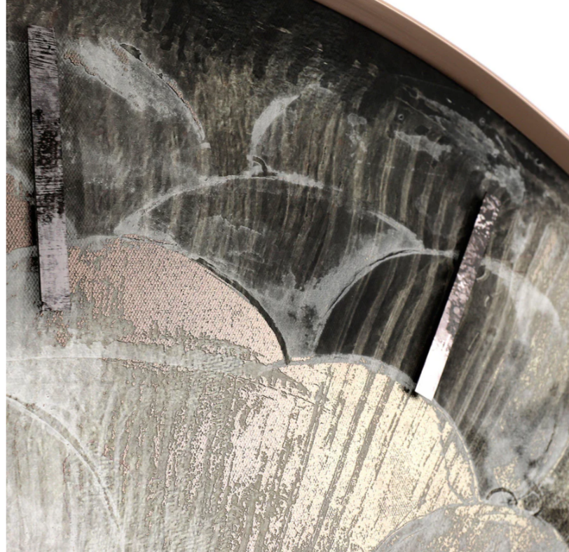 Inspired by the elegance of the 1920s, the Charleston design features a scalloped edge with a brass foiled rim, distressed mirrored ticks, and decorative hands.